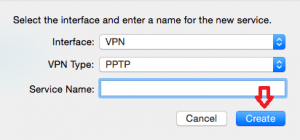 مطابق تصویر زیر ، Interface را برابر با VPN و VPN Type را برابر با PPTP قرار داده و مقابل Service Name کلمه YektaVPN وارد کرده و بر روی Create کلیک کنید.